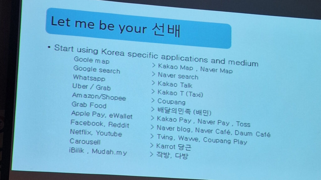 Selepas sesi saya selesai. Seorang alumni menyampaikan tajuk “I wish I had a Sunbae”. Sunbae bermaksud senior di Korea. Sebagai penutup sesi perkongsian kepada para penerima biasiswa.