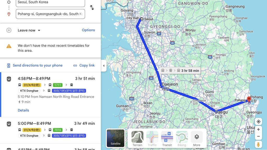 - Bas: Seoul Express Bus Terminal > Pohang Express Bus Terminal (3 jam 40 minit)