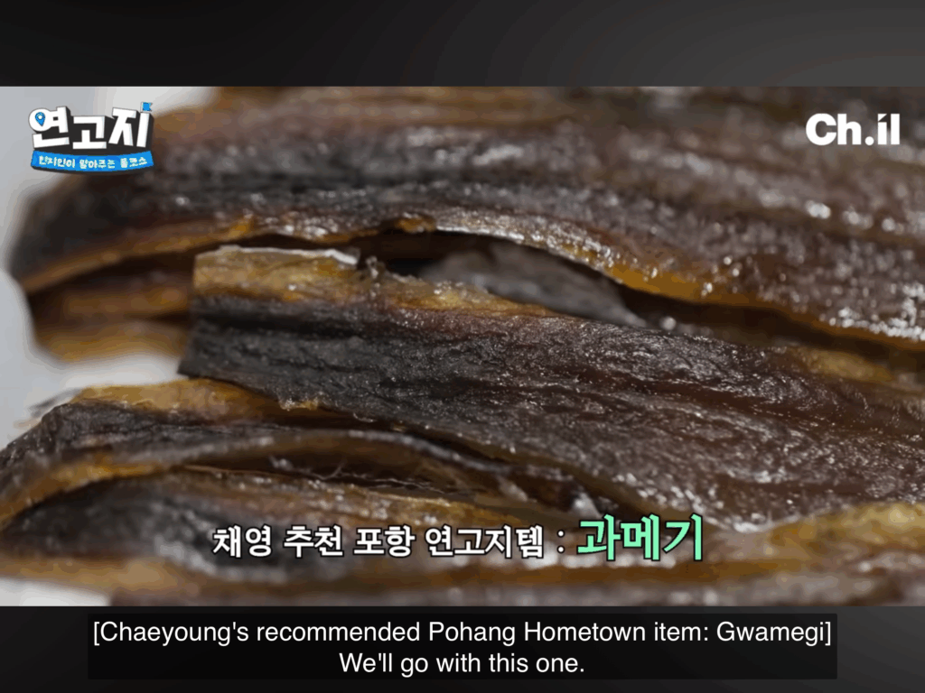 Chaeyoung mencadangkan makanan ringan seperti gwamegi (hidangan istimewa musim sejuk yang diperbuat daripada ikan hering kering) yang kenyal. Sedap dimakan bersama balutan rumpai laut.