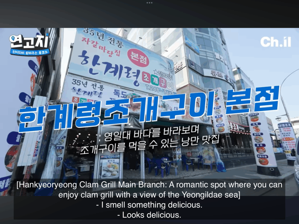 Mereka menamatkan episod dengan singgah makan di restoran (tradisi 35 tahun) yang menghidangkan kerang panggang , makanan laut, dan sup kerang dengan menyajikan pemandangan laut pantai Yeongildae.